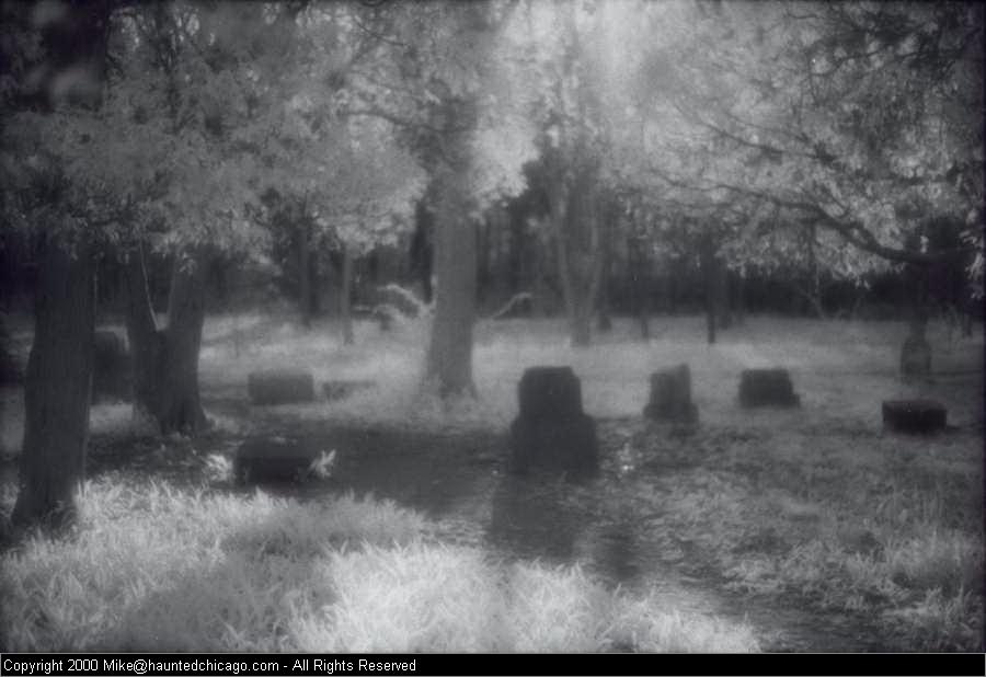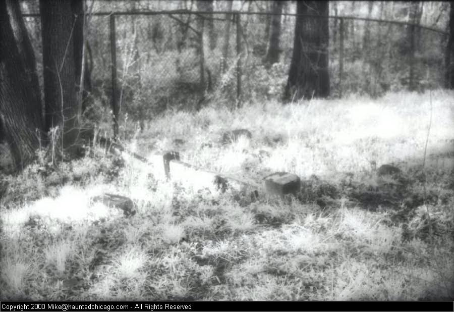 Focus - April 24, 1999 - Bachelor's Grove Cemetery. Notice the poor focus in this image. Focusing through the lens without IR compensation will yield results like these. This is due to the fact that the infrared light, which is composed of light of a longer wavelength, focuses somewhat behind the negative. (Minolta X-370, Kodak HIE 135-36, flash)